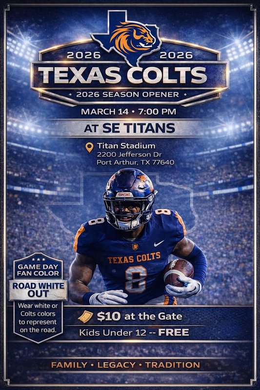 Tonight, your Texas Colts were crowned the 2025 BSFL State Champions defeating the SE TX Titans 34-14. The game was ended as a power outage halted game play. We would like to thank the fans for your continued support. This has been a milestone and our players, coaches and staff are thankful to be able to share this moment with you. Stay tuned for more information as the Colts celebrate this occasion.
