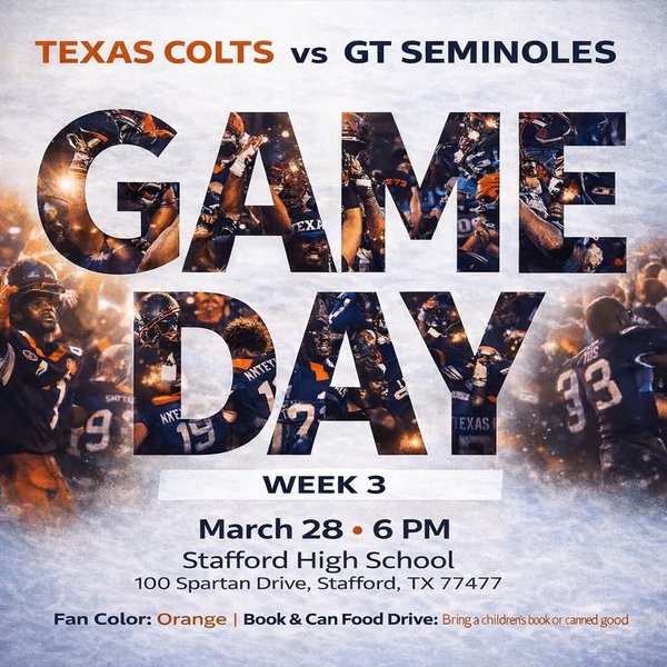 This Saturday, your Colts take on the GC Bluecatz at Stafford High School. Kickoff is at 6pm, so get your popcorn ready for some action packed football.