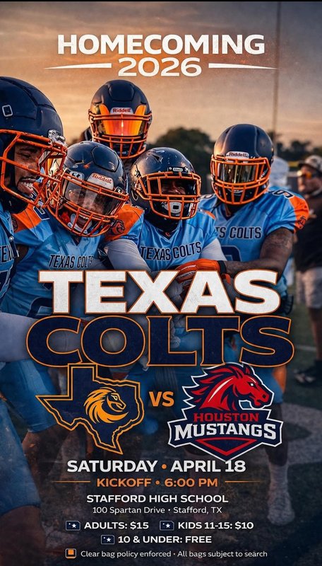 Colts fans, tickets are going fast for this weekends match-up between the Texas Colts and the 713 Cardinals. Hurry and get your tickets as they are on sale for $10 until 11:59 Thursday night. After that, the gate fee is $20. Act now and come to support your Colts. The link is below!